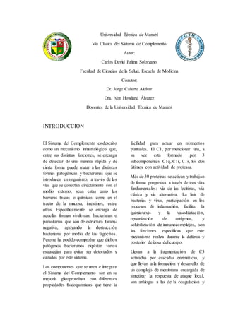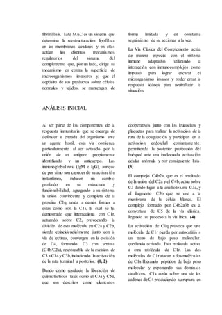 La vía clásica del sistema del complemento se activa cuando los anticuerpos se unen a antígenos en la superficie de patógenos. Esto causa la unión del componente C1q y la activación de una cascada enzimática que involucra a los componentes C1r, C1s, C4, C2 y C3, resultando en la opsonización de patógenos, quimiotaxis, inflamación y lisis celular. Algunas bacterias como Pseudomonas aeruginosa secretan enzimas como la proteasa alcalina que inhiben la vía cl