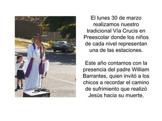 El documento describe el Vía Crucis anual realizado en una escuela preescolar el 30 de marzo. Los niños de diferentes niveles representaron las 14 estaciones del Vía Crucis mientras el padre William Barrantes les recordaba el sufrimiento de Jesús camino a su muerte. La escuela celebró las Pascuas de Resurrección tras completar el Vía Crucis.