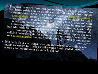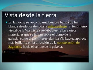 Este documento proporciona información sobre la Vía Láctea. Explica que se ve como una banda brillante en el cielo nocturno debido a las estrellas y gas interestelar que contiene. Se divide en tres partes principales - el halo, el disco y el bulbo. El disco contiene la mayoría de las estrellas jóvenes y gas, incluyendo brazos espirales. El bulbo se encuentra en el centro densamente poblado. La galaxia también contiene cúmulos globulares y galaxias satél