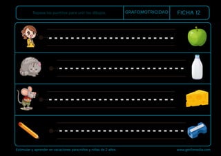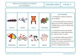 El documento propone actividades de vocabulario para niños de 2 años que involucran identificar y nombrar dibujos de objetos como coche, avión, silla y tortuga. También incluye actividades para desarrollar habilidades como grafomotricidad, conceptos espaciales, atención y discriminación visual.