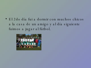 El documento describe las actividades de vacaciones de una persona durante dos semanas. En la primera semana, descansó, durmió en la casa de un amigo y jugó al fútbol. Luego visitó a su abuela en su cumpleaños y salió con amigos al cine, al bowling y al campo de deportes. En la segunda semana, fue al cine en varias ocasiones con amigos y familiares, visitó el planetario con sus tíos, y pasó tiempo en el club y descansando antes de volver a clases.
