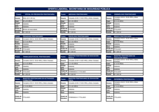 Este documento presenta una oferta laboral para varios puestos en la Secretaría de Seguridad Pública. Se describen 16 puestos diferentes como oficial en prevención penitenciaria, abogado penitenciario, criminólogo penitenciario y otros. Para cada puesto se especifican detalles como horario, edad requerida, estado civil, sexo, grado de estudios y sueldo. La mayoría de los puestos requieren de un título universitario y ofrecen un sueldo de $11,500.