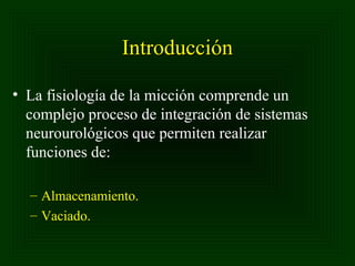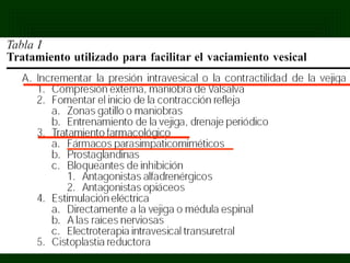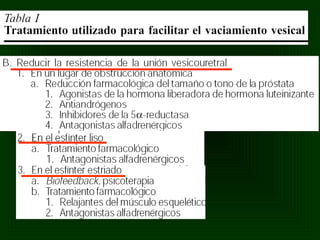 Este documento resume las drogas que facilitan el vaciado vesical. Explica la fisiología de la micción y los trastornos del vaciado vesical. Luego describe varias drogas como el cloruro de betanecol, que actúa como agonista colinérgico para aumentar la contracción vesical, aunque tiene efectos secundarios. También menciona antagonistas alfa adrenérgicos como la tamsulosina que reducen la resistencia uretral, y baclofen y dantrolene que actúan sobre el esfínter estriado para