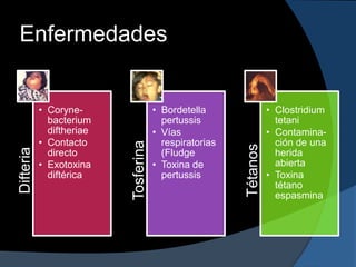 El documento resume información sobre tres enfermedades infecciosas: difteria, tos ferina y tétanos. Las vacunas contra estas enfermedades incluyen toxoides para difteria y tétanos y cepas inactivadas de Bordetella pertussis para tos ferina. Las vacunas se administran de forma combinada y se recomiendan dosis de refuerzo periódicas para mantener la inmunidad.