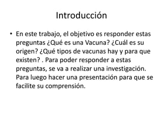 Este documento resume el origen y tipos de vacunas. Explica que las vacunas provocan una respuesta inmune sin causar la enfermedad completa mediante la introducción de antígenos debilitados o muertos. La primera vacuna fue desarrollada por Edward Jenner en 1796 contra la viruela usando el virus de la viruela bovina. Existen cuatro tipos principales de vacunas: inactivadas, atenuadas, toxoides y subunitarias.