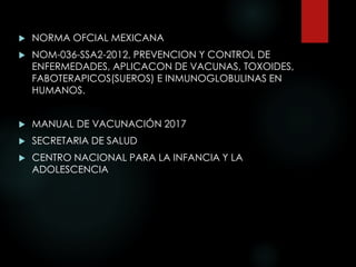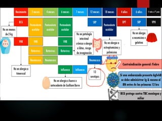 Este documento proporciona un resumen del esquema de vacunación en México. Detalla las diferentes vacunas recomendadas, incluyendo contra la difteria, tos ferina, tétanos, poliomielitis, hepatitis B, neumococo, influenza, sarampión, rubeola, parotiditis, rotavirus, VPH y varicela. Explica los antígenos contenidos en cada vacuna, la vía de administración, edad y número de dosis recomendadas. También menciona contraindicaciones específicas de algunas vacunas. El objet
