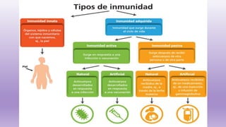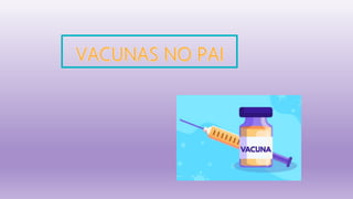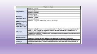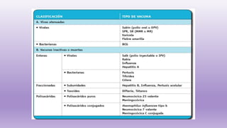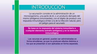 El documento habla sobre las vacunas y su importancia. Explica que las vacunas pueden administrarse de forma simultánea sin producir efectos distintos a cuando se aplican de forma separada. También describe los diferentes tipos de vacunas, sus características, edades de aplicación, dosis y vías de administración, así como posibles reacciones adversas y contraindicaciones.