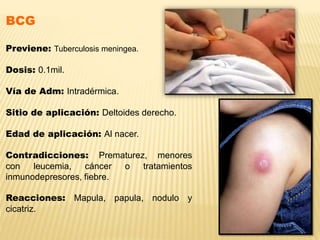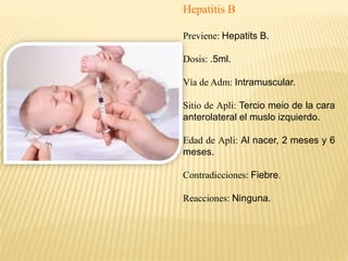 El documento proporciona información sobre diferentes vacunas, incluyendo las enfermedades que previenen, dosis, vía de administración, sitio de aplicación, edad de aplicación, contraindicaciones y posibles reacciones. Describe vacunas como BCG, hepatitis B, pentavalente acelular, rotavirus, neumococcica 13 valente, SRP, influenza, DPT, TD y DTPA.