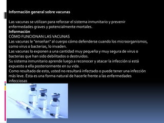 Las vacunas se utilizan para reforzar el sistema inmunitario y prevenir enfermedades graves y potencialmente mortales. Funcionan exponiendo al cuerpo a una pequeña cantidad de virus o bacterias debilitados para que el sistema inmunitario aprenda a reconocer y atacar la infección. Existen cuatro tipos de vacunas y es importante vacunarse según el calendario recomendado para protegerse contra muchas enfermedades que solían ser comunes como el tétanos, la difteria y el sarampión.