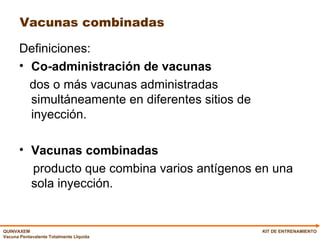 El documento proporciona información sobre las vacunas combinadas. Explica los beneficios de las vacunas combinadas como menor dolor para los pacientes, administración simplificada y mejor adherencia a los programas de vacunación. También describe una vacuna pentavalente específica que protege contra difteria, tétanos, pertussis, hepatitis B e influenza tipo B. Se detallan los estudios clínicos realizados y los resultados que demuestran su alta inmunogenicidad y buena tolerabilidad.