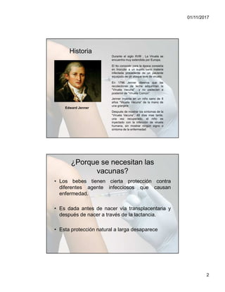 El documento proporciona información sobre vacunas. Explica que las vacunas generan inmunidad contra enfermedades estimulando la producción de anticuerpos. Se administran principalmente por inyección, aunque algunas son por vía nasal u oral. También describe que Edward Jenner desarrolló la primera vacuna contra la viruela en 1796 y que las vacunas protegen contra enfermedades infecciosas que eran comunes y potencialmente mortales, enseñando al cuerpo a defenderse de microorganismos.