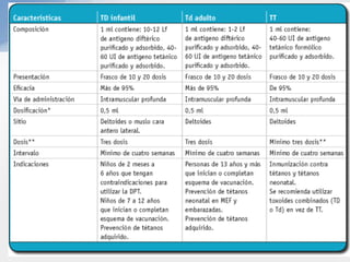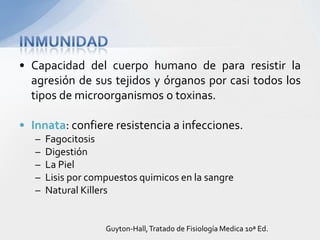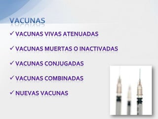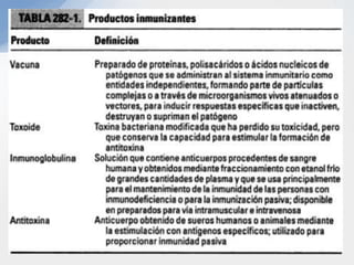 El documento describe los diferentes tipos de inmunidad, incluyendo la inmunidad innata y adquirida. También explica los mecanismos de acción de la inmunidad humoral e inmunidad mediada por células, así como los diferentes tipos de vacunas como las vivas atenuadas, inactivadas, conjugadas, recombinantes y sus usos.