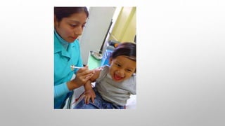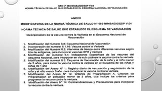 Este documento presenta un resumen cronológico de las principales vacunas de uso humano desde 1796 hasta la actualidad, así como información sobre las vacunas incluidas en el calendario nacional de vacunación peruano para diferentes grupos etarios, incluyendo niños, adolescentes y adultos. Además, proporciona definiciones clave sobre términos relacionados a la inmunización.