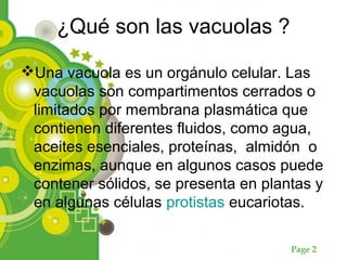 Las vacuolas son orgánulos celulares rodeados por una membrana que contienen líquidos y sustancias como agua, proteínas y almidón. Se forman principalmente por la fusión de vesículas en el citoplasma y cumplen funciones como almacenar sustancias, regular la presión celular y la digestión de nutrientes. En las células vegetales pueden llegar a ocupar hasta el 90% del volumen celular y almacenan agua y nutrientes.