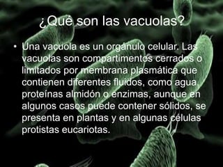 Las vacuolas son orgánulos celulares que se encuentran en plantas y algunas células de protistas. Contienen fluidos como agua, proteínas y enzimas. Existen varios tipos de vacuolas como las pulsátiles, digestivas y alimenticias. Están delimitadas por una membrana y cumplen funciones como almacenar nutrientes y desechos, mantener la presión de turgencia en las células vegetales y aislar compuestos tóxicos.