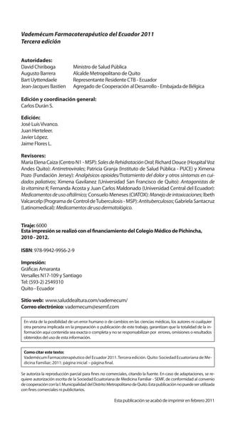 Este documento presenta el Vademécum Farmacoterapéutico del Ecuador 2011, una guía de medicamentos que incluye información sobre posología, interacciones, efectos adversos y uso de fármacos durante el embarazo y lactancia. El vademécum está organizado por sistemas y contiene fichas de más de 700 medicamentos. Fue editado por expertos ecuatorianos y revisado por especialistas, con el objetivo de proporcionar información actualizada sobre el uso racional de medicamentos en el país.