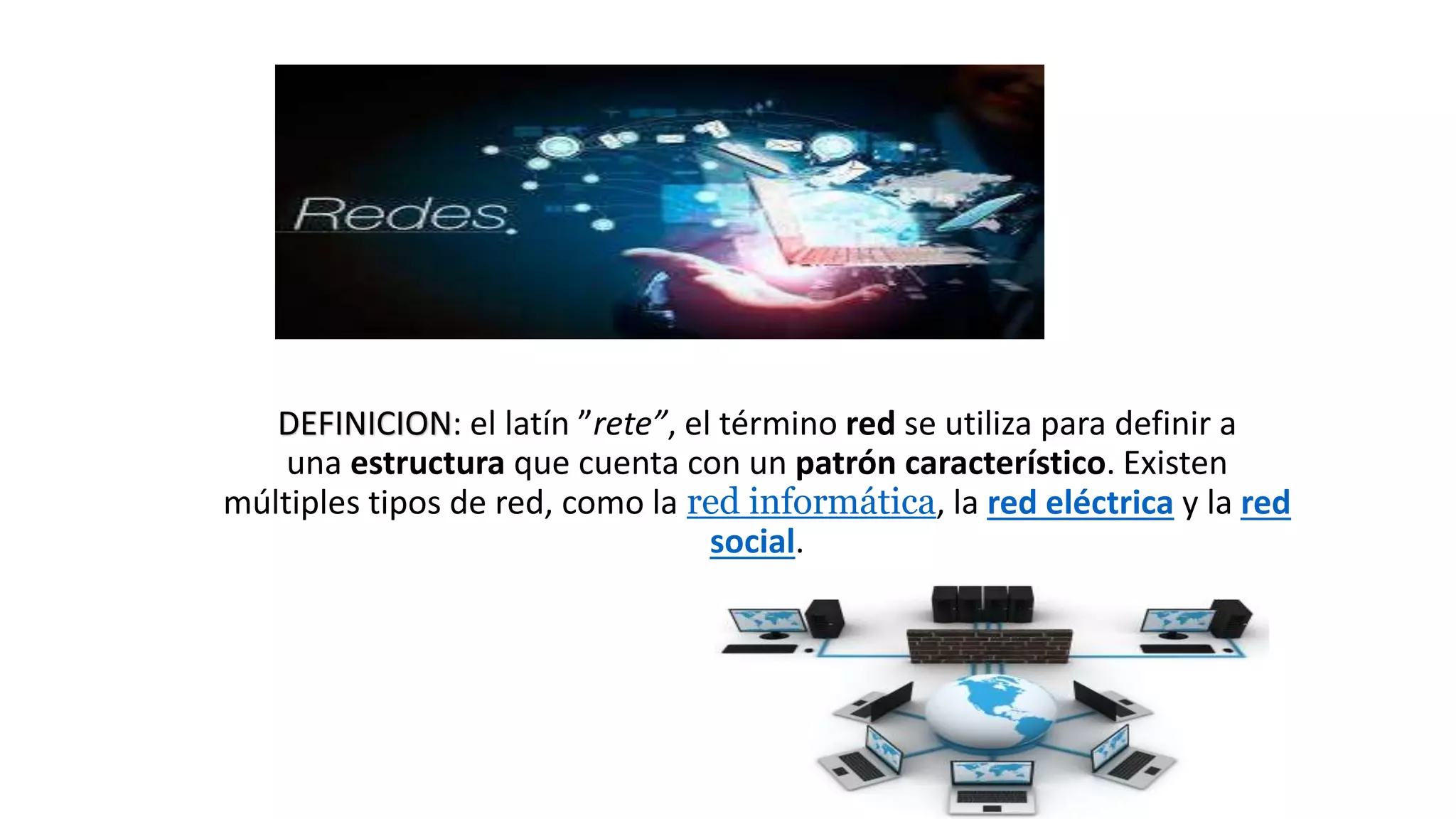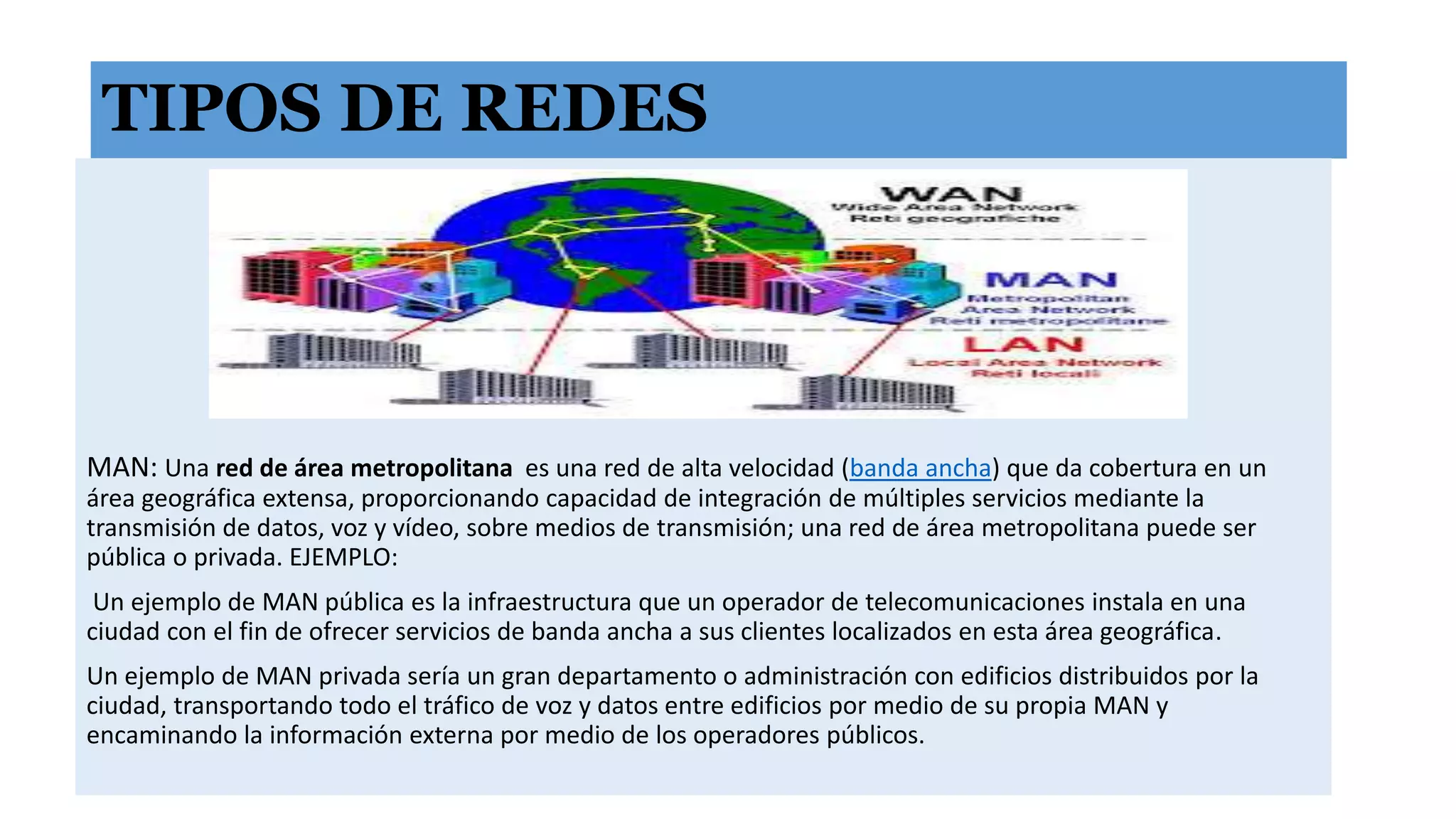 El documento define varios tipos de redes, incluyendo redes de área metropolitana (MAN), redes de área local (LAN) y redes de área amplia (WAN). También describe diferentes topologías de red como bus, árbol, estrella y malla. Por último, explica los componentes clave de una red como cables trenzados, coaxiales, de fibra óptica y de plano.