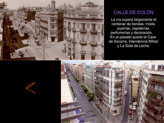 Este documento presenta un recorrido histórico por diferentes calles y lugares de Valencia, describiendo cómo eran en el pasado y comparándolos con el presente. Se mencionan edificios, tiendas y atracciones turísticas que ya no existen, así como nuevas construcciones que han embellecido la ciudad, como el Palau de la Música y los jardines a lo largo del río. A pesar de los cambios, el documento concluye que Valencia sigue siendo una ciudad preciosa.