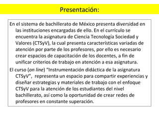 Este documento presenta la primera actividad del primer módulo de un curso en línea sobre la asignatura de Ciencia Tecnología Sociedad y Valores (CTSyV) para profesores de bachillerato en México. El objetivo es que los participantes aprendan a utilizar entornos virtuales y herramientas de comunicación electrónica para el aprendizaje a distancia. Las actividades incluyen consultar recursos en línea, descargar documentos, analizar el programa del curso, comunicarse con otros participantes, y elaborar un esquema conceptual y directorio