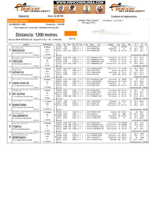 El documento describe eventos de carreras de caballos en Valencia, incluyendo detalles sobre cada carrera como la distancia, premios, y los ejemplares participantes. Se mencionan resultados de ganadores y los cambios de implementos para diversos caballos, junto con información de sus propietarios y entrenadores. También se incluyen datos de las carreras desde el año 1994 hasta la fecha reciente.