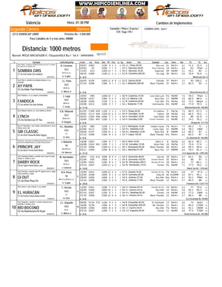 El documento detalla los resultados de varias carreras de caballos, incluyendo información sobre ejemplares, jockeys y premios. Se especifican anotaciones como la distancia de las carreras y los tiempos de los ganadores. Además, se mencionan los equipos y los cambios de implementos para los caballos participantes.