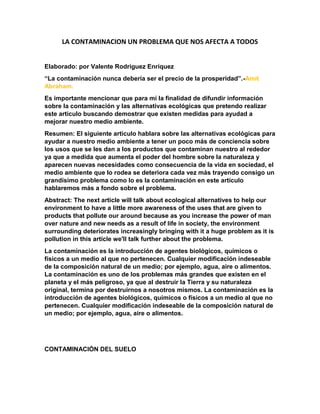 El documento habla sobre los diferentes tipos de contaminación como un problema grave que afecta al medio ambiente y a la salud humana. Describe la contaminación del suelo, agua, ruido, y visual y sus causas principales como desechos industriales y domésticos, lluvia ácida, ruido de tráfico e industrias, y basura en las calles. Concluye que debemos tomar conciencia sobre este problema y buscar formas de mejorar la calidad del medio ambiente.