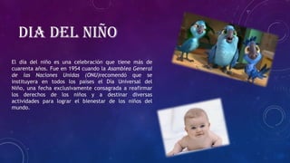 El Día del Niño es una celebración que se lleva a cabo en diferentes fechas en diferentes países para reafirmar los derechos de los niños y promover su bienestar. La Asamblea General de las Naciones Unidas recomendó en 1954 que todos los países instituyeran el Día Universal del Niño para destinar actividades a mejorar el bienestar infantil global y fomentar la fraternidad entre los niños del mundo.