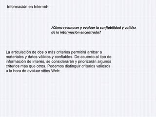 El documento habla sobre cómo evaluar la confiabilidad y validez de la información encontrada en Internet. Menciona algunos criterios valiosos como el tipo de dominio, la antigüedad del material y la posibilidad de excluir ciertas palabras. También explica que al realizar una búsqueda avanzada se pueden desplegar términos y palabras clave relacionadas y cómo clasificar los resultados. Por último, comenta sobre catálogos e índices especializados y nuevos buscadores como Searchme y Viewzi que ofrecen vistas preliminares