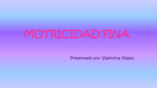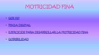 La motricidad fina se refiere a los movimientos precisos de los músculos de la mano y la integración con la vista. Inicialmente los niños agarran con toda la mano pero luego desarrollan la pinza digital usando el pulgar e índice. Ejercicios como cortar, abrochar botones y hacer nudos ayudan a desarrollar la motricidad fina. Además, la mayoría de los niños desarrollan una preferencia por usar su mano derecha.
