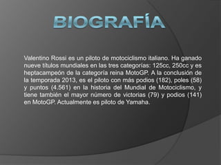 Valentino Rossi es un piloto de motociclismo italiano que ha ganado nueve títulos mundiales en tres categorías diferentes: uno en 125cc, uno en 250cc y siete en MotoGP. Actualmente tiene el récord de más victorias, podios y puntos en la historia del Campeonato Mundial de Motociclismo. Rossi comenzó su carrera profesional en 1993 y actualmente compite para Yamaha.