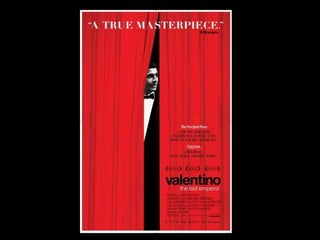 El documento resume la industria de la moda actual como muy competitiva donde priman la rapidez y economía sobre la exclusividad y creatividad. Valentino se describe como el último gran emperador de la moda cuya visión artística ya no es suficiente para la industria. El documental muestra cómo la compañía Valentino veía al diseñador como un gran gasto y necesitaba adaptarse sustituyéndolo.