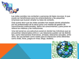 Las redes sociales pueden contactar a personas de bajos recursos, lo que puede beneficiar a emprendedores y pequeñas empresas que buscan ampliar su base de contactos. También han sido adoptadas por profesionales de la salud para gestionar conocimientos institucionales y resaltar médicos e instituciones. Una red social es una estructura donde individuos se relacionan de diferentes formas como amistad, finanzas o interacción a través de chats y foros.