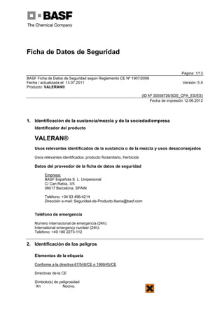 Este documento proporciona información sobre la seguridad de un producto fitosanitario llamado VALERAN®. Contiene detalles sobre su composición química, identificación de peligros, primeros auxilios, medidas de protección, almacenamiento y manipulación segura. El producto contiene varios ingredientes peligrosos como pendimetalina e isobutanol. Debe almacenarse y usarse con precaución para evitar riesgos para la salud y el medio ambiente.