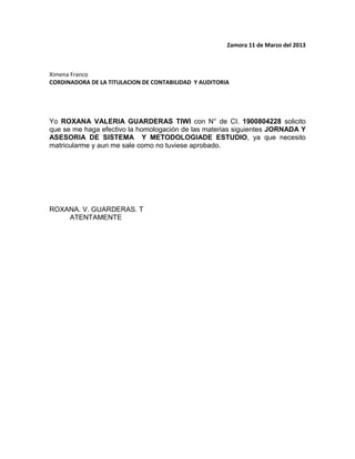 Roxana Guarderas solicita la homologación de dos materias, Jornada y Asesoría de Sistema y Metodología de Estudio, ya que necesita matricularse pero las materias todavía aparecen como no aprobadas. Ella proporciona su número de identificación para facilitar la homologación.