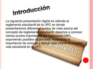 El documento habla sobre el reglamento estudiantil de la UPC. Explica que el reglamento es un conjunto de normas que establecen los derechos, deberes y procedimientos dentro de una institución. Destaca la importancia de conocer el reglamento para saber cómo proceder en diferentes situaciones como estudiante y para tener un sentido de pertenencia a la institución.