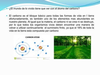 El documento trata sobre varios temas de química. Explica que el carbono es el bloque básico de la vida y uno de los elementos más abundantes en la Tierra. También describe procesos como la maduración de los frutos debido a la degradación de la clorofila, la coagulación de la sangre gracias a la fibrina, y los componentes químicos de la miel de abeja y el cuerpo humano. Asimismo, explica por qué el jabón saca la mugre atrayendo las moléculas no polares, y por