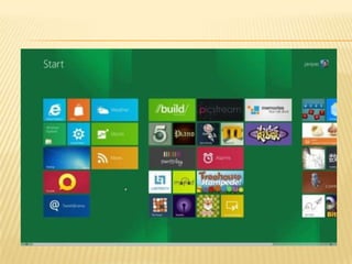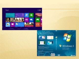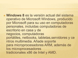 Este documento proporciona información sobre Windows 8, incluyendo sus características, requisitos de hardware, versiones, recepción crítica y lanzamiento. Windows 8 es la versión actual del sistema operativo de Microsoft para computadoras personales y añade soporte para procesadores ARM además de x86.