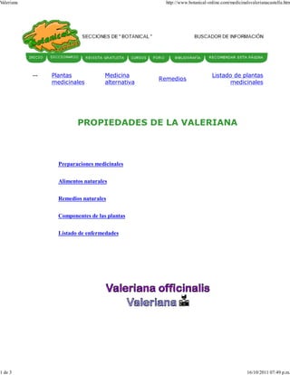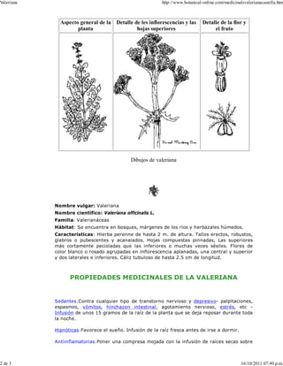 Este documento describe la planta medicinal Valeriana, incluyendo sus propiedades, usos y cómo cultivarla. Explica que la Valeriana se usa comúnmente como sedante e hipnótico, y también tiene propiedades antiinflamatorias y para estabilizar el ritmo cardíaco. Recomienda infusiones de la raíz seca para tratar problemas de sueño, estrés y como apoyo para dejar de beber alcohol.