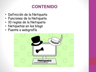El documento presenta la definición y funciones de la netiqueta, que se refiere a las normas de comportamiento en internet, adaptando las reglas de etiqueta del mundo real al entorno virtual. Se detallan diez reglas de la netiqueta que promueven el respeto y la convivencia en línea, así como principios específicos aplicables a los blogs. También se incluyen fuentes relevantes para profundizar en el tema.