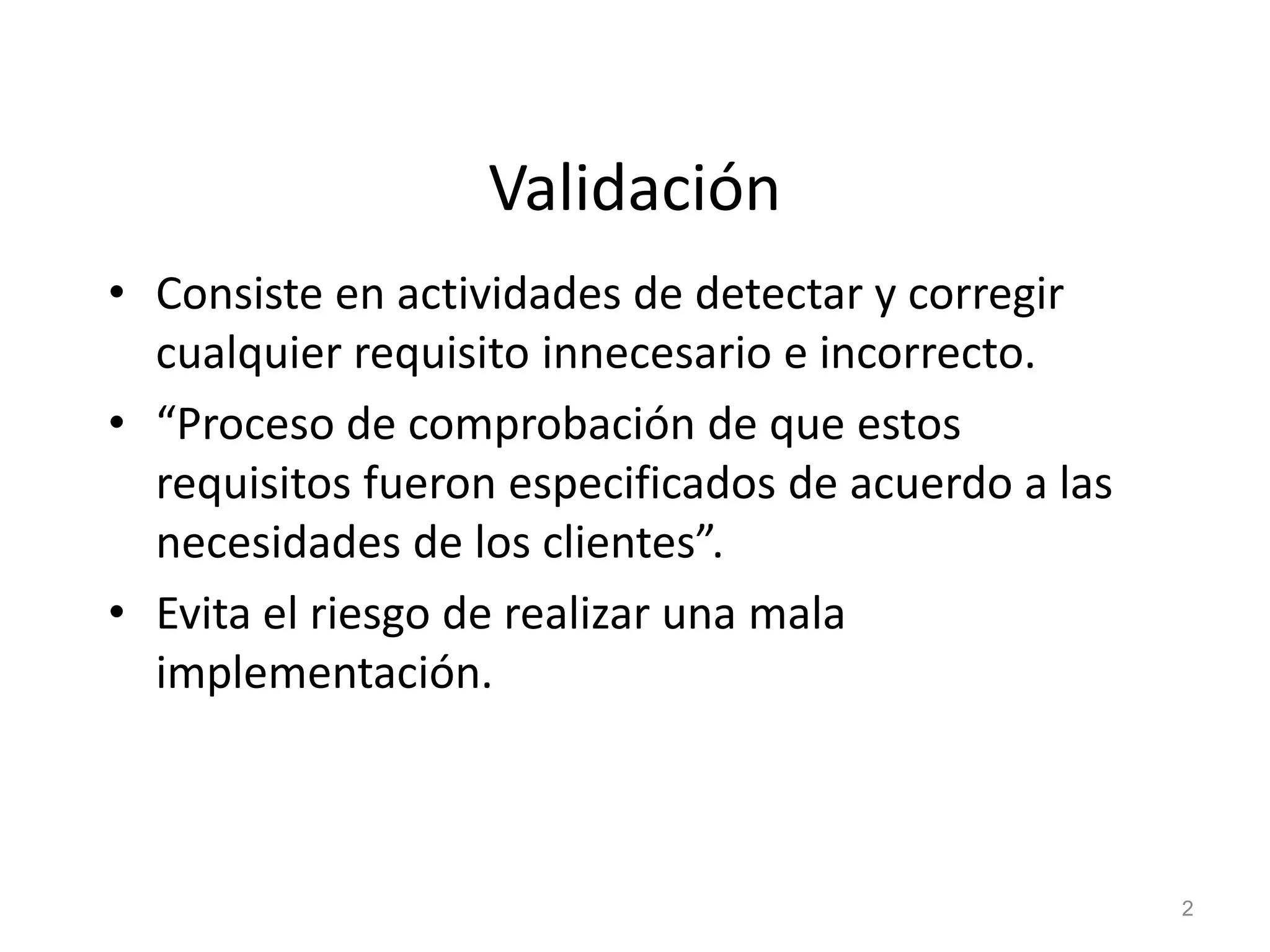 La validación de requisitos consiste en detectar y corregir cualquier requisito innecesario o incorrecto para evitar una mala implementación. Involucra seleccionar técnicas de validación apropiadas, asegurar la participación adecuada de los usuarios para revisar la documentación, y validar un subconjunto de requisitos al inicio del desarrollo.