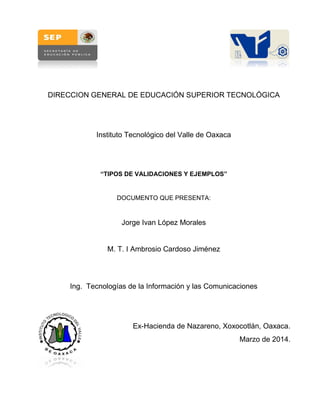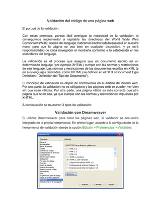Este documento describe diferentes métodos para validar el código de una página web, incluyendo el uso de Dreamweaver, el validador del W3C, e instalando un complemento de validación en Firefox. Explica que la validación asegura que el código cumple con los estándares del lenguaje como XHTML. También muestra ejemplos de errores comunes y cómo corregirlos usando estas herramientas de validación.