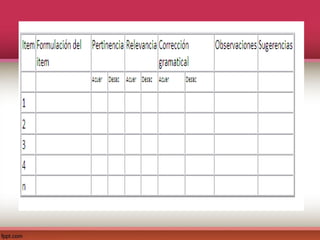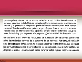 Este documento discute la validez como un aspecto psicométrico fundamental. Define la validez como la capacidad de un instrumento para medir lo que pretende medir. Explica que la validez incluye evidencia teórica, estadística y empírica acumulada a través del tiempo. También describe los diferentes tipos de validez como validez de contenido, criterio y constructo, y cómo la perspectiva ha evolucionado de enfocarse en la correlación con criterios externos a una visión más integral de la validez de constructo.