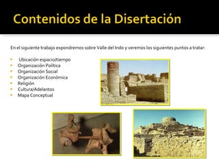 El documento resume la civilización del Valle del Indo, que floreció entre el 2500 y el 1600 a.C. en el noroeste de la India. La civilización incluía más de 100 aldeas y dos grandes ciudades, Harappa y Mohenjo-Daro, y tenía una estructura social jerárquica basada en castas. Practicaban la agricultura y el comercio, y desarrollaron sistemas de riego y alcantarillado avanzados. Seguían una religión politeísta que creía en la reencarnación. La civilización