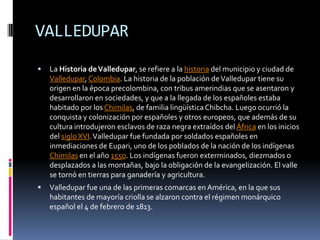 Valledupar fue fundada por soldados españoles en 1550 cerca del poblado indígena de Eupari. Los indígenas fueron exterminados o desplazados y el valle se convirtió en tierras para ganadería y agricultura. Valledupar fue una de las primeras comarcas en alzarse contra el régimen español en 1813. Actualmente, Valledupar es conocida por su Festival de la Leyenda Vallenata, que celebra la música vallenata cada abril, y por sus monumentos que homenajean la cultura e historia local