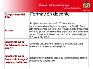 El documento resume tres componentes del Plan de Acción Municipal (PAM) en Valledupar, Colombia entre noviembre de 2009: (1) formación docente en competencias tecnológicas, donde se capacitó a 1,200 docentes; (2) acompañamiento a instituciones educativas a través de proyectos transversales que beneficiaron a 20,735 estudiantes; y (3) uso de tecnologías de la información y comunicación mediante mejoras a la infraestructura tecnológica que beneficiaron a 43,000 estudiantes con mayor ac