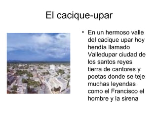 1) El documento describe la ciudad de Valledupar, conocida como la "Tierra de los cantores y poetas" y hogar de importantes figuras como la Cacica y Francisco el Hombre.