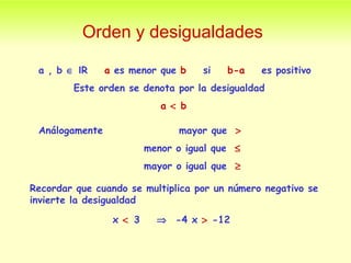 Este documento describe conceptos básicos de los números reales y conjuntos. Introduce la recta real, números naturales, enteros y orden numérico. Explica la notación de intervalos en la recta real como (a,b), [a,b], (-∞,b), etc. También define conjuntos de números reales como uniones e intersecciones y el valor absoluto de un número.