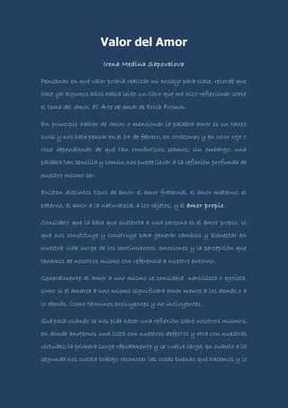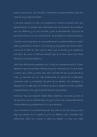 Este documento discute la importancia del amor propio. Argumenta que el amor propio es la base para generar cambios positivos en la vida y relacionarse con los demás. Sin embargo, a menudo se juzga negativamente el amor propio como egoísta. El documento sugiere que empezar por aceptarse y amarse a uno mismo, con sus virtudes y defectos, permite comprenderse mejor a uno mismo y a los demás.