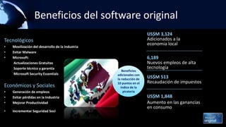 El documento detalla los beneficios del software original, incluyendo impactos económicos y sociales, tales como generación de empleos y recaudación de impuestos. Asimismo, se aborda la reforma a la ley de propiedad intelectual en México, la cual establece sanciones por la piratería y promueve la legalización del software. Además, se destaca la importancia de estrategias de educación y verificación para empresas respecto al cumplimiento de licencias de software.