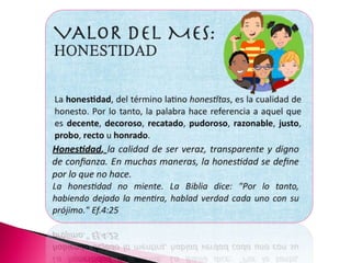 El documento habla sobre la honestidad. Define la honestidad como un valor que consiste en actuar de acuerdo a lo que se piensa y se siente. Describe que una persona honesta habla con la verdad, renuncia a las mentiras, y defiende sus valores por encima de beneficios personales. También enumera algunas características de una persona honesta como ser sincero, cumplir con sus compromisos, y evitar la murmuración.